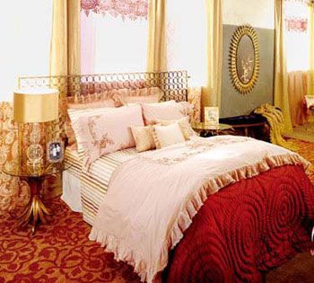 搭配手法:在臥室內(nèi)大膽啟用金色和深紅色的組合,卷草紋腳柱的床頭邊幾,太陽(yáng)造型的裝飾鏡,窗幔上的蕾絲,讓初秋的臥室看起來(lái)如同巴洛克時(shí)期的宮殿一樣富麗堂皇。