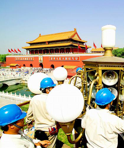 為配合長安街中段的道路南擴,在從西單北大街至人民大會堂西路南側(cè),路燈管理中心將29基華燈整體南移17.6米,新增華燈4基。值得一提的是,這4基華燈的樣式、高度、形狀與長安街上具有50年歷史的華燈一模一樣,長安街和天安門廣場上的華燈風(fēng)貌與最初設(shè)計得到了完美統(tǒng)一。