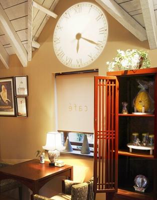 刷白的尖形木屋頂下,粉紅粉綠調(diào)的掛畫、彩繪的花瓶、咖啡杯、還有一眼便難忘的那用英式復(fù)古瓷磚貼成的壁爐式墻面,臨近傍晚的時(shí)候,對(duì)著街道的窗戶上,投影著一個(gè)圓形鐘,用影子在行走時(shí)間的鐘,下面的窗簾上印著褐色的café字母。時(shí)光和咖啡香一樣,此刻感覺(jué)因太過(guò)悠閑而變得縹緲