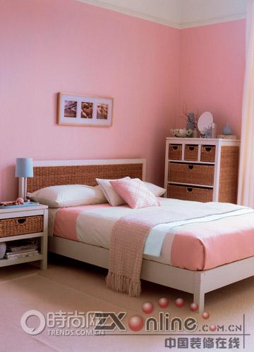 概要: 巧妙與鮮明粉紅色的墻面定下整體基調(diào),給人以朦朧的浪漫感覺。CrucialTrading的灰白色羊毛地毯,以及Harlequin白色窗簾與粉紅色過度十分自然。白色的床邊小桌和柜子仍然帶藤制抽屜,桌上放有藍(lán)色托盤和藍(lán)色臺(tái)燈,是整體色調(diào)中活潑的一筆,柜子上飾以小圓鏡、藍(lán)色花瓶和小花枝。