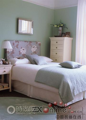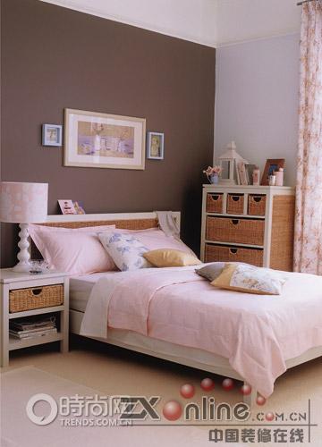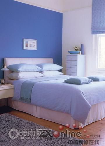 巧妙與鮮明 粉紅色的墻面定下整體基調(diào),給人以朦朧的浪漫感覺。Crucial Trading 的灰白色羊毛地毯,以及Harlequin 白色窗簾與粉紅色過度十分自然。白色的床邊小桌和柜子仍然帶藤制抽屜,桌上放有藍(lán)色托盤和藍(lán)色臺(tái)燈,是整體色調(diào)中活潑的一筆,柜子上飾以小圓鏡、藍(lán)色花瓶和小花枝。灰白色的床上覆以Laura Ashley 粉紅色的床罩,白色床單、白色枕頭、藍(lán)、粉色小靠墊,溫暖而舒適。
