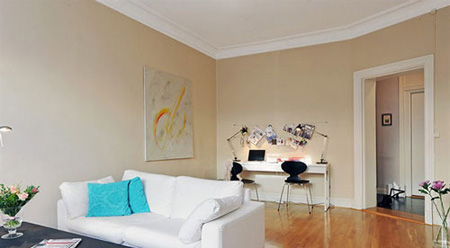 空間不大,所以裝修中選用了白色為主,奶茶色墻壁,白色系的家具,柚木色的地板,使整個空間迅速拉升放大。