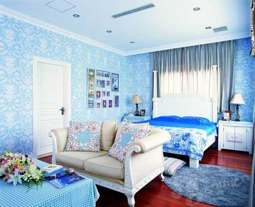 點(diǎn)睛:藍(lán)色的淺淡清雅,最適合作為背景色大面積使用,壁紙、墻面涂料、軟裝是藍(lán)色的活躍舞臺(tái)。要想烘托出藍(lán)色的嫵媚多變,用白色的家具和配飾進(jìn)行調(diào)和最為妥當(dāng)。