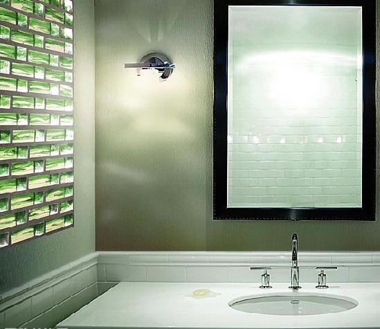 雙層霧玻璃磚墻因?yàn)榭梢蕴峁┝己玫牟晒庑Ч粢?、隔熱,?jié)約能源并有延續(xù)空間的感覺,從而成為部分人裝修居室墻面的時(shí)尚選擇。其實(shí)在家庭裝修中,不論是單塊鑲嵌使用,還是整片墻面使用玻璃磚,都會(huì)有畫龍點(diǎn)睛的效果。