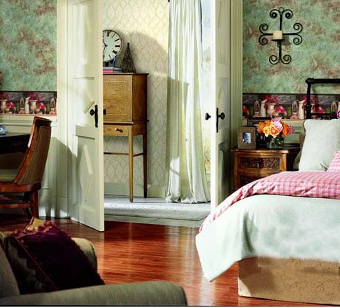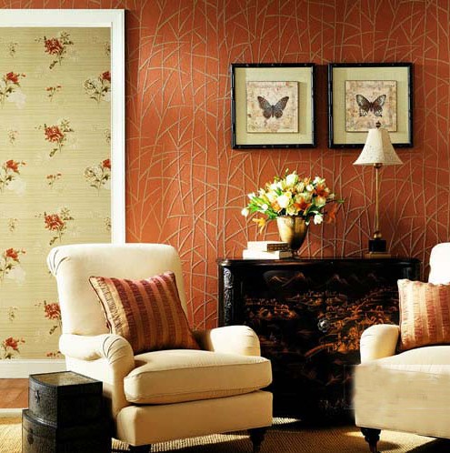布藝:單是一面墻壁使用了壁紙,自然會顯得很突兀。注意在靠包和腳凳等小面積的面料選擇方面與之相呼應(yīng)。布料的花型比例大小應(yīng)與壁紙相當(dāng),在顏色方面也要保持一致。