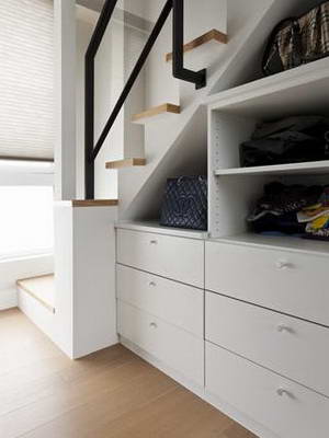 本案例開始的時候就強調(diào)過,這套房子的收納值得多種戶型借鑒。這雖然只是一個樓梯下方則做成了一個展示及收納柜,閑散空間得到絕佳利用。