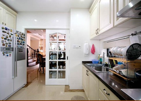 ②嵌在櫥柜中的電器設(shè)備?,F(xiàn)在廚房面積大小比較適中,電器隨之帶進(jìn)了廚房??筛鶕?jù)個(gè)人不同需要,把冰箱、烤箱、微波爐,洗碗機(jī)等布置在櫥柜中的適當(dāng)位置,方便開啟、使用。