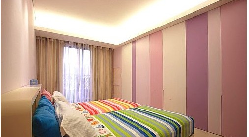 還在讀幼兒園的小女孩的房間利用線條顏色勾勒出小女生活潑的感覺,用曲線圓形來突顯兒童的趣味性,窗戶的設(shè)計(jì)也以弧度的轉(zhuǎn)角來修飾。