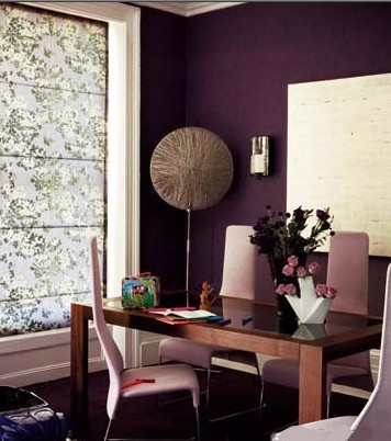 餐廳的墻面被涂刷成深李子色,好像顯得有些沉悶。而具有啞光銀效果的墻面裝飾畫以及白色餐椅,再加上線條簡單的配飾,則讓這里頓時擁有了優(yōu)雅好客的氣氛。