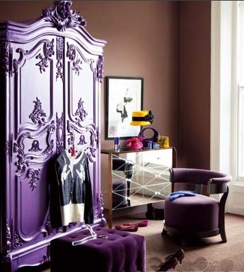 如果你是視覺沖擊力很強的色系的忠實擁護者,那么千萬不要錯過這個最奪目的房間造型。散發(fā)著珍珠光澤的紫色古典樣式衣柜,觸感舒適的絲絨沙發(fā)凳,搭配用鏡面裝飾的梳妝臺,制造出位的華麗效果。