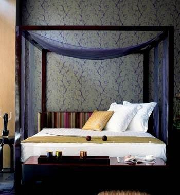 臥室中色調(diào)柔和的布藝床頭莊重典雅而不乏輕松浪漫的感覺,與灰紫色暗花紋壁紙和深紫色的格紋地毯相互呼應(yīng),多層次的色彩變化,中和了深色家具帶來(lái)的冷靜,帶有灰度的柔和色調(diào)讓整個(gè)房間停留在雅致迷人的氛圍里。