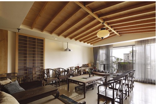 其中運用竹簾拉門、隔屏所圍塑的客廳一隅,以姿態(tài)古雅厚實的羅漢床為主題,規(guī)劃為舒適宜人的休閒區(qū),透過室內(nèi)半穿透元素的巧妙運用,有效延伸了視覺的轉(zhuǎn)折。