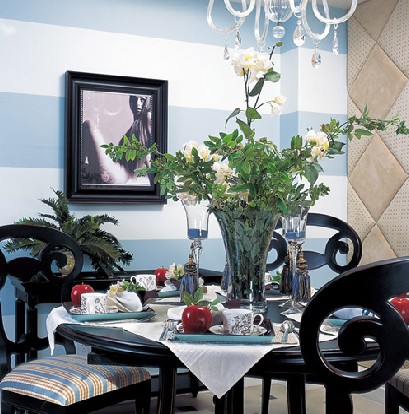 運(yùn)用家飾布不僅能夠增加家具的質(zhì)感,更能營(yíng)造出漸層的效果,純白色餐具即使層層疊疊,在視覺(jué)上仍較為平面,一但加入桌巾與餐墊,餐具的高低差立即唿之欲出,藍(lán)與白對(duì)比搶眼,也讓海洋風(fēng)味蔓延開(kāi)來(lái)。