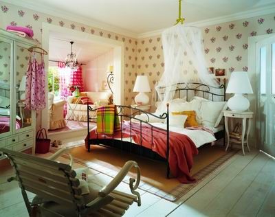 床是臥室的活動中心,所以應當擺放在房間的中部,并且通向床的道路應盡量通暢,使其成為最方便接近的地方。如此放置使人感覺房間被床分成了兩部分,因而看起來更大一些。兩個床頭柜分置于床的兩邊。衣柜則放置在床的對面,這樣既對稱,又能非常方便地看電視。