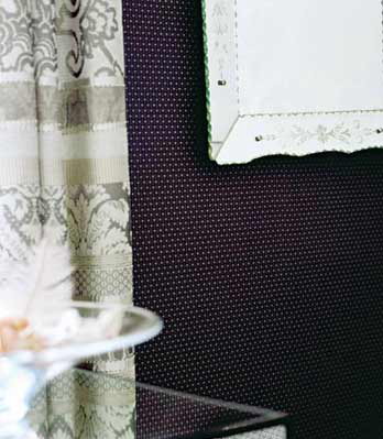 灰黑色條紋窗簾搭配凹凸紋理的黑色壁紙,層次分明。鏡面家具、裝飾品讓黑色墻面有了一些通透感。簡約而略帶復(fù)古圖案的布藝壁紙演繹著上世紀(jì)的優(yōu)雅品位,繁華而不失現(xiàn)代格調(diào)。