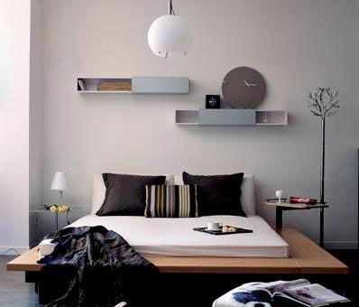 利落的線條充滿整個房間,原木色的寬邊床可移動的小幾設(shè)計周到,背景墻上錯落安置的CD架,利用材料的多元變化和幾何造型的有機(jī)融入,讓視覺呈現(xiàn)出舒緩的起伏,金屬衣架豎立要床旁,既實用又強(qiáng)調(diào)了空間的設(shè)計感。