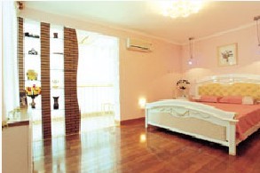 為了追求臥室空間的浪漫、溫馨,設(shè)計師選用溫和的粉紅色作為主調(diào),墻面、頂面、地板和諧搭配。由于陽臺的啞口過寬,空間交流太過充分,所以做了紅色方磚墻柱來分割空間,美化了居室。