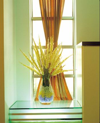 把原本細(xì)長的窗戶加以延伸,運用玻璃、鋼條兩種似近非近、張揚個性的材質(zhì)層層疊加,組成晶瑩剔透的小裝飾臺。讓陽光透過玻璃的棱角放射出閃耀的光芒,照射在圓潤的玻璃花瓶上,讓藍(lán)、黃、白色的水晶球一捧原野無味的干草花,一切就像一個默默無聞的傾聽者,把業(yè)主的情致、個性傳達(dá)得淋漓盡致,而人的心情也會在這個小空間里頓生幾分愉悅。