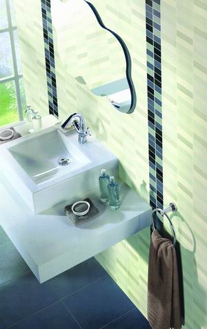 使用腰線來增強(qiáng)觀賞性,可根據(jù)整體的搭配效果選擇橫排和豎排的腰線,腰線的圖案和磁磚的顏色要協(xié)調(diào),一般來說,在衛(wèi)生間里的腰線和磁磚都以素雅圖案為佳。