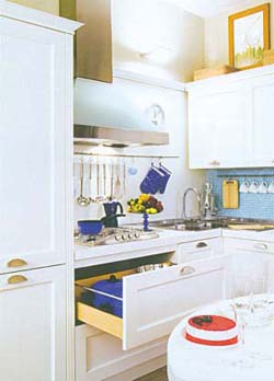 白漆櫥柜令小廚房充滿了明亮印象,人造石臺面與櫥柜渾然一體,品質(zhì)感絲毫不減。在與壁柜相接的空白墻面上,天藍色玻璃馬賽克令流動的視覺產(chǎn)生出美妙的變化。所有的餐廚用具都以藍色、白色和金屬色為主,統(tǒng)一的色彩使小廚房里沒有任何的雜亂。