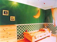 例如床上方的月亮,仿佛正在編制著一個多姿多彩的夢,并讓孩子的夢想插上翅膀,盡情飛翔。由于已經(jīng)上學(xué),這時孩子的房間多了一些電器,因此在書架上、窗臺上擺上一兩簇花草,調(diào)節(jié)屋內(nèi)空氣。