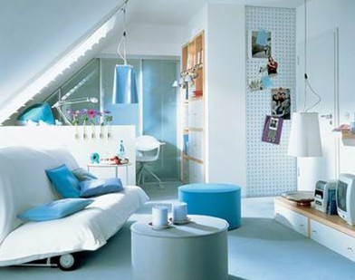 書房的書與書柜可稱為大提琴之聲,古老的藝術(shù)品、字畫好似長號低鳴,而電腦裝置猶如鋼琴般的可愛動聽;綠色花草給人一種豎琴和橫笛樣的輕松。其實(shí),在書房中放置高級組合音響也不錯(cuò),讀書學(xué)習(xí)之余,調(diào)節(jié)一下神經(jīng)是必要的??傊?,書房的裝飾布置應(yīng)反映出多重的文化情趣來。書房如果不兼作客廳,那便是一個(gè)私人盡善盡美的空間了。