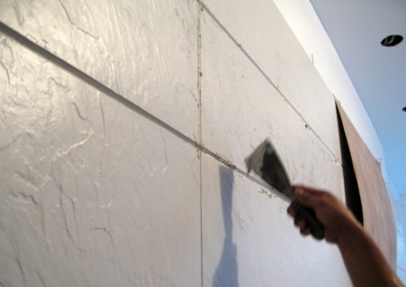 5.瓷磚上墻:將瓷磚貼上板墻,同時(shí)在銅線(xiàn)掛鉤處擰上螺絲,就像掛畫(huà)一樣。