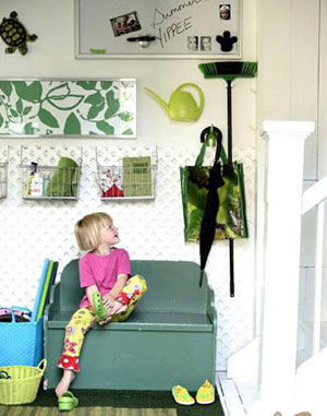 2、這是個(gè)(專(zhuān)門(mén)存放濕衣物或沾泥衣物的)沾泥物品寄存室,一個(gè)灰綠色的長(zhǎng)椅與這個(gè)空間中其他元素一起創(chuàng)造出令人愉悅的清新感覺(jué)。