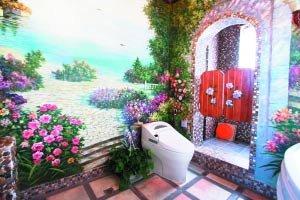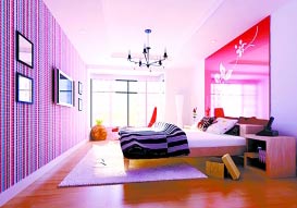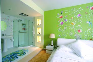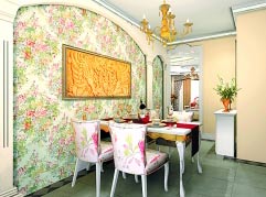 大花圖案目前引用在室內(nèi)裝飾中有幾種,一種是噴繪、手繪,手繪效果最好,但造價(jià)較高,很多人接受不了。而噴繪造價(jià)低一些,但可能沒(méi)有手繪那么有靈性。整個(gè)房間使用大花圖案時(shí)一定要注意,房間要夠大,花色要夠素,否則容易給人很燥很亂的感覺(jué)。