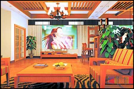 客廳與休閑室之間的墻中間被掏了一個方形洞,洞四周用木框包邊,做成窗戶的樣子。而客廳的電視機(jī)就放在窗戶上,給人的感覺是一面電視墻。在這個大窗框后面就是休閑室的墻,建議墻上用大幅山水畫或油畫,在室內(nèi)營造一幅藝術(shù)美景。裝飾裝修