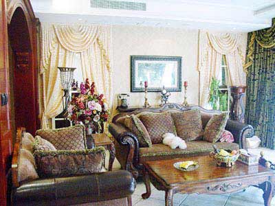 這是個(gè)歐式古典的小客廳,沙發(fā)區(qū)由一個(gè)3人沙發(fā)和兩個(gè)椅子構(gòu)成,非但不是成套的,連顏色也不相同,但是給人的感覺(jué)非常舒服。