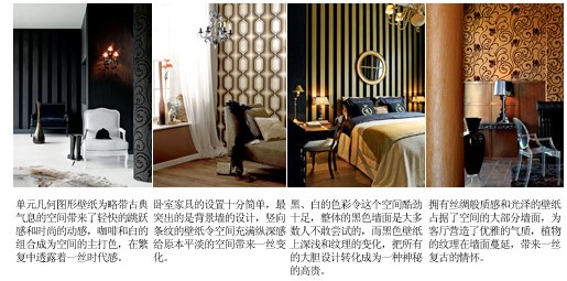 整體效果:異域元素的壁紙?jiān)谏噬鲜值驼{(diào),通常最突出的表現(xiàn)是壁紙上帶有異國(guó)特色的紋理裝飾,不同的花紋能帶來(lái)不同國(guó)度的韻味,不同的植物更有不同地方區(qū)域的特點(diǎn),用深色或者單一色彩打底才能凸現(xiàn)這些花紋帶來(lái)的異域風(fēng)情,異域元素的出現(xiàn)可以恰到好處地安撫普通空間的過(guò)于平淡,也可以彰顯個(gè)性空間的獨(dú)特審美,為空間蓋上時(shí)尚的印章。與異域元素搭配的家具大多線(xiàn)條簡(jiǎn)潔,在質(zhì)感和細(xì)節(jié)的設(shè)計(jì)上卻有過(guò)人之處,精致和細(xì)膩的家具是異域風(fēng)情最好的詮釋。