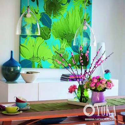 1.大的帆布畫,淡綠色和水藍(lán)色形成鮮明對比,給整個空間以視覺沖擊。