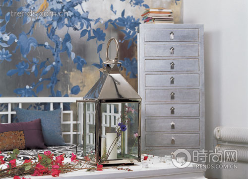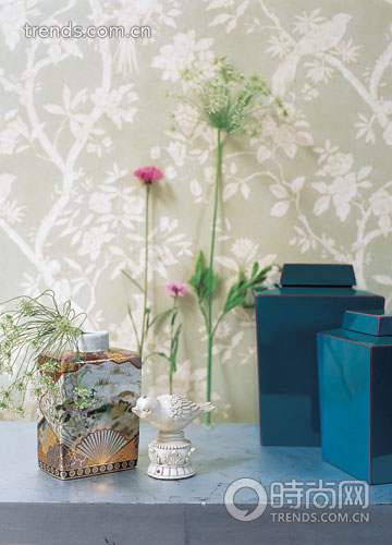 生活應該是富有變化的,不同風格的素材可以一起營造故事:西方的手提不銹鋼玻璃油燈放在明清古典床榻上,榻面已重新上了一層白漆;西洋白瓷小鳥飾品立在自然圖騰壁紙前,和花材一起唱響鳥語花香;碩大的中式扇面和酒瓶高腳杯及彩瓷香爐在抽屜柜上訴說的是在中式的調(diào)子中略帶些波希米亞的浪漫風情。