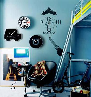 裝飾講究個(gè)性和偏好,把各種各樣的鐘表釘在墻上,灰色的墻面看起來不再呆板,有些童趣的造型,線條簡(jiǎn)單,詼諧有趣,讓人心情愉悅,墻面也變得鮮活起來。