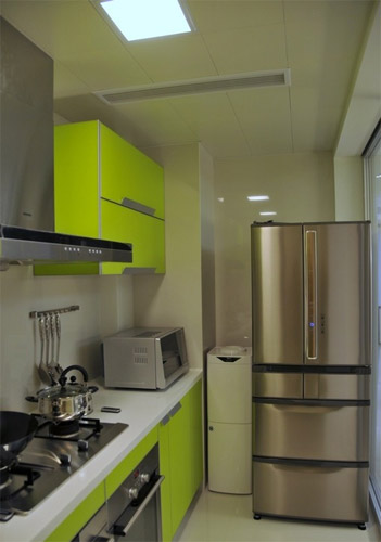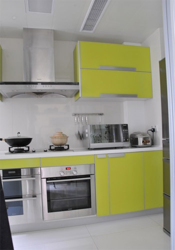 一般家居由于廚房的空間不大,所以色彩較淡的廚具較受歡迎,如綠色、淺灰色。在廚具表面的材質(zhì)方面以耐火板為主流。改良后的耐火板不僅光彩奪目,其耐熱、耐用性能更有顯著提高,一改以往質(zhì)弱印象。成套廚具在儲物功能設計上亦愈顯精心、精密,一掃以往零亂、難尋的窘境。