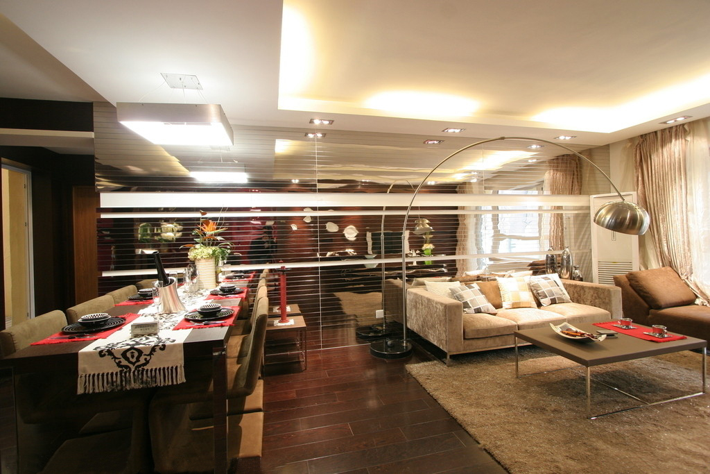 這是客廳跟餐廳的全景圖,具以現(xiàn)代風(fēng)格為主題。沙發(fā)同餐椅為棕色系,客廳大塊的棕色短毛地毯 配以深咖的實(shí)木板,造型簡潔的茶幾,U型落地?zé)?。中國紅的餐墊是這里軟裝飾的亮點(diǎn),讓現(xiàn)代感更具中國特色。