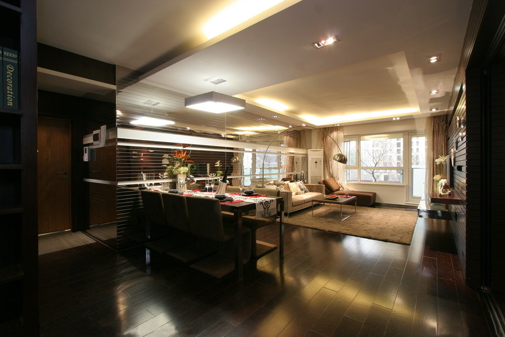 概要: 兩室兩廳的戶型在很多樓盤里面都充當(dāng)著主打?! ∵@是客廳跟餐廳的全景圖,具以現(xiàn)代風(fēng)格為主題。沙發(fā)同餐椅為棕色系,客廳大塊的棕色短毛地毯 配以深咖的實(shí)木板,造型簡潔的茶幾,U型落地?zé)?。中國紅的餐墊是這里軟裝飾的亮點(diǎn),讓現(xiàn)代感更具中國特色?! ≌驹谂P室門口看客廳全景。雖然采取開放式的,但是絲豪沒有影響空間的美感。為了區(qū)別,客廳及餐廳采取不同的吊頂。
