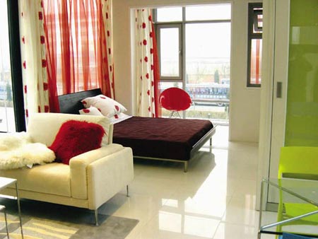 紅色波點(diǎn)軟裝、米色沙發(fā)、大紅色抱枕都可以看出小女生的情懷,而且光線通透,打開房門一眼望盡所有,一切掌握在自己手中。