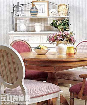 由于不少家庭出于戶型的考慮,并未特地開辟家居餐廳,但卻可以稍費心思在客廳的某個位置標(biāo)新立異,于是一個特殊的就餐環(huán)境便能在客廳的范圍內(nèi)“渾然天成”。白色櫥柜因為鐵藝擱架的設(shè)計變得有些與眾不同,上面可以擺放些物品,集收納、展示于一體。而原木色餐桌與方格布藝餐椅椅墊相互搭配,形成悠閑清爽的地中海風(fēng)格。就餐的心情便像地中海的微風(fēng)迎面吹來般享受愜意。