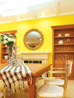 新鮮色彩需要細(xì)節(jié)點亮 紅葉桉木餐廳家具典雅而不滯重,透明珍珠白餐椅面輕松明快,刷成明黃色的背景墻既明麗可人,又不露鋒芒;古典掛墻鏡略帶洛可可風(fēng)格,華麗而神秘……這個餐廳空間看不到一絲慵懶和沉悶,一束白玫瑰不經(jīng)意地點綴其中,整個空間跳躍著的滿是春的鼓點。