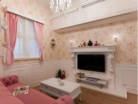 客廳。田園風(fēng)的壁紙,歐式純白電視背景墻與粉色沙發(fā),都是絕美的色調(diào)搭配,整個空間設(shè)計精致、唯美。