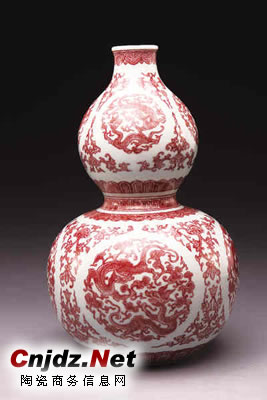 此件釉里紅團(tuán)龍紋葫蘆瓶不僅形制規(guī)整,構(gòu)圖嚴(yán)謹(jǐn),且呈色鮮艷,完美地詮釋了乾隆時(shí)釉里紅名品之樣,從中也可窺見當(dāng)時(shí)制瓷的高超工藝。相同作品的乾隆釉里紅團(tuán)龍紋葫蘆瓶在北京故宮博物院隨安室陳設(shè)著一對(duì);北京藝術(shù)博物館藏有一件。另外,香港蘇富比1990年春拍中曾以319萬元成交了一件乾隆釉里紅團(tuán)龍紋葫蘆瓶,與此瓶樣式相同,此外尚未見有其他記載。由此可見,此類乾隆釉里紅葫蘆瓶傳世者極為罕見,而如本次上拍這件之發(fā)色鮮艷者更為難得,實(shí)屬可遇而不可求之官窯精品。 上海裝潢網(wǎng)