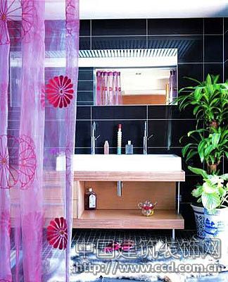 冷調(diào)的粉紫是調(diào)情的高手,手工刺繡的雛菊圖案在紫紗上若隱若現(xiàn),給沉悶的衛(wèi)浴帶來遐想,沉醉在這明艷的色調(diào)中,享受全身心的放松吧!來點綠植,大片的綠葉豐富了黑色瓷磚的層次,給浴室?guī)砹藷o限的生機。上海裝潢網(wǎng)][NextPage