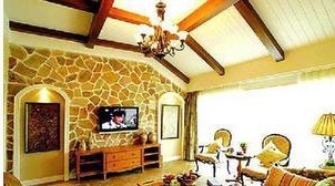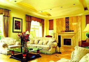 本案例中力求在簡約化的歐式氣息中,彰顯主人的文化追求和藝術品位。豐富的光影使室內的線條錯落有序。木質的電視墻裝飾別具一格,沙發(fā)的一側是裝飾壁爐,米色大理石的地面以少許深色圖案作為點綴,鮮亮的色彩對比使整個空間顯得高貴、生動。