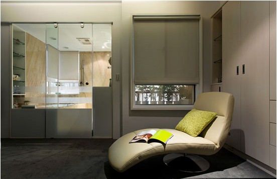 運用清玻璃及卡典西得的材質(zhì),成為與衛(wèi)浴空間的中介因子,下方條紋的語匯與主臥床頭應(yīng)對著。地面深灰色運用使整個空間看上去不是那么的蒼白。