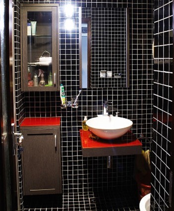 因此,設計裝修這一款衛(wèi)浴室的時候,正是緊緊圍繞這一主題展開的。除了合理布局浴缸、坐便器與盥洗盆,減少洗浴、洗衣和化妝洗臉的相互干擾等因素外,在色彩上也有一定的個性。黑色的亮光玻璃馬賽克,中間點綴一點紅色,這樣形成既深刻又強烈的視覺感。同時使用大片的吊頂鏡面來增加空間感,衛(wèi)浴中間是一個特別大的白色浴缸。白色浴缸與黑色墻面和地板,形成黑白分明的反差,再加上紅色馬賽克的點綴,增加了幾分魅惑和迷離。