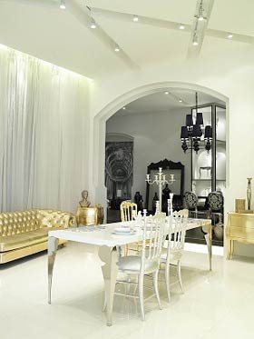 復(fù)古風(fēng)格家具在這些色調(diào)下看起來(lái)好似一幅幅現(xiàn)代摩登場(chǎng)景。眩目的金銀光澤帶來(lái)富有沖擊力的奢華視覺(jué);黑與金的沖撞,帶著些許妖媚;而柔美、安嫻的白色,褪去了金銀光澤中的世俗煙火氣,略加少許淡藍(lán)色的點(diǎn)綴,幾乎呈現(xiàn)出某種天使般的圣潔氣息。