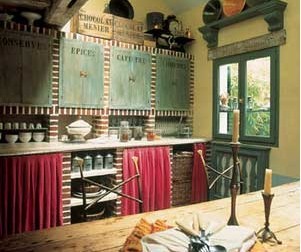 有效收納,只能算作是對廚房功能上的考慮。廚房和居室中其它區(qū)域一樣,還要有視覺的呈現(xiàn),這才能真正體現(xiàn)出設(shè)計的匠心所在??催@一處廚房,不難感受到它的歐陸鄉(xiāng)村風格,這緣于它大面積原木的使用。粗礫的面板帶出原始的情懷,而吊柜與壁櫥的紅磚框架與白灰嵌線,表現(xiàn)出當下十分流行的懷舊風。另外我們可以注意到,這一間廚房特別講究視覺的完整性與開闊性,而這一特色的實現(xiàn)來自于吊柜的整齊柜門與壁櫥的紅色掛簾,將它們關(guān)閉或者掛上,呈現(xiàn)于你眼前則沒有了廚房通常難以回避的繁雜層次,而只是一副簡潔的歐陸風情畫。柜門的綠與掛簾的紅成了整體視覺設(shè)計上的點睛之筆,不僅讓這種復(fù)古的情調(diào)更加濃郁,而且還平添了幾分殷實之氣。