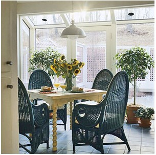 很多家庭將四季陽(yáng)光房當(dāng)成臨時(shí)餐廳。陽(yáng)光房的裝修和布置一般會(huì)隨季節(jié)變化而改變,因此沒(méi)有固定的風(fēng)格。隨季節(jié)和心情而定吧。圖中餐廳的柳條椅,各種盆栽,黃色的花束,為冬日的暖房帶了夏日的溫暖氣息。